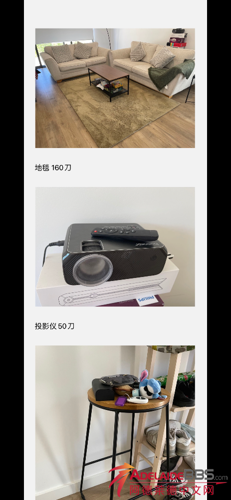 地毯 160刀 投影仪50刀(已出) 高脚椅5刀 椅子15刀(已出) 泡泡染发剂(粉色)免费 桌游三个一起10刀 桌子30刀 置物架10刀(已出) 加湿器30刀 台灯5刀 电加热器15刀 自提 Campbelltown 短信04777708809
