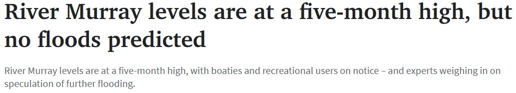 南澳政府已发布关于在River Murray游玩的建议,进行水上娱乐项目的游客应倍加谨慎。 然而,DEW表示并没有发布 "洪水预警"。DEW发言人称:"在这种情况下,预计受影响的地区将是沿河边缘的洼地。” ...