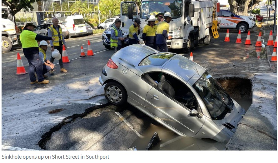 位于黄金海岸Southport的Short Street因水管破裂出现巨大天坑,一辆汽车陷入坑内。 办公室工作人员Carolyn Brown表示,她上下班时经常把车停在这个地方。她说:"就在我过来的时候,我看 ...