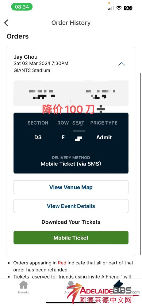 • 降价出一张周杰伦悉尼场,原价528现428出,
