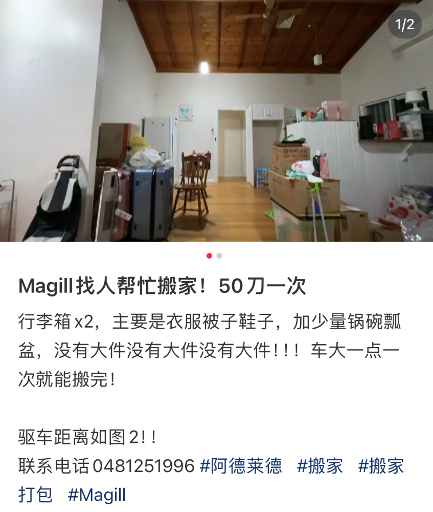 Magill找人帮忙搬家,一点衣服被子,没有大件,价格好商量!!!