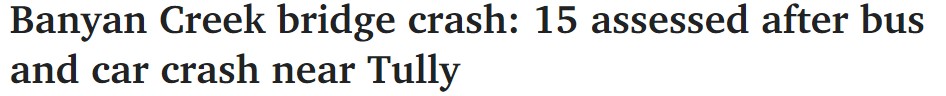 据悉,周二下午,一辆旅游巴士和一辆轿车相撞后冲入昆州北部Bruce Highway旁的路堤,8人被紧急送往医院。 下午5点左右,一辆载有15人的巴士和一辆轿车在Tully的Banyan Creek bridge相撞。 15人接受了救护 ...