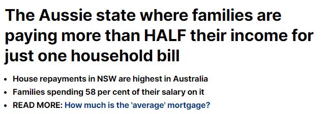 澳洲住房可负担性恶化,超一半的收入用于还房贷! 据DailyMail最新报道,新州的住房可负担性创下了历史新低,家庭被迫拿出每周收入的一半以上来维持住房。 澳大利亚房地产研究所报告发现,新州的家庭不得不花费 ...