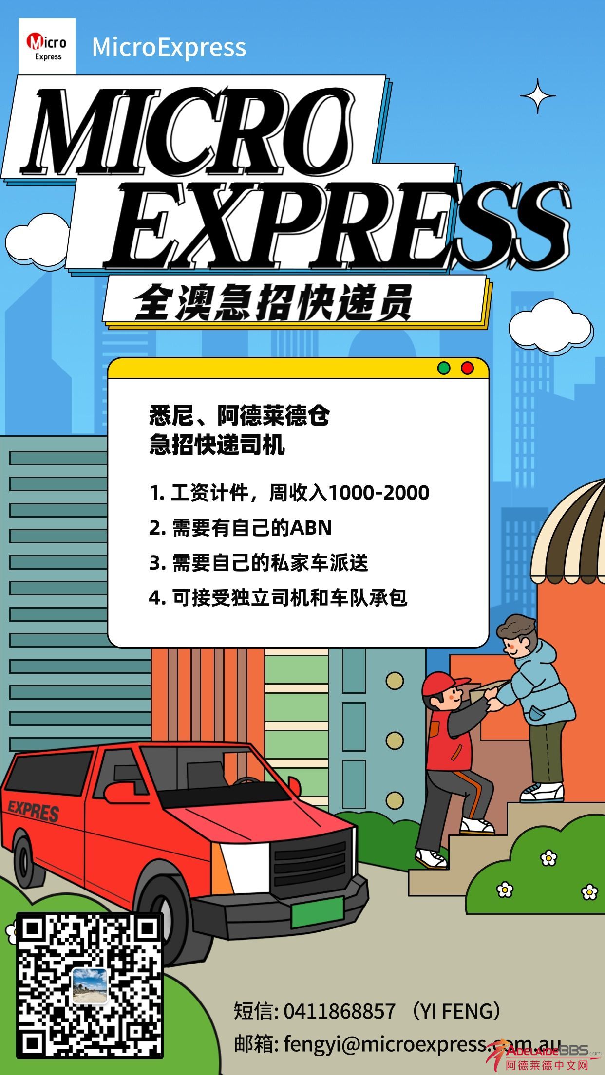 Micro Express阿德莱德站点急招司机 按每计件结算,周收入1000-2000(平均时薪30-40AUD) 可独立司机或者车队承包 自己的私家车可以派送,需要有ABN 欢迎有类似经验者前来 联系人:Yi Feng 短信联系:041186 ...