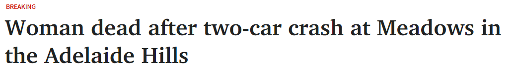 周三下午,阿德莱德山区发生一起两车相撞事故,一名妇女在医院死亡。 另一辆车的司机68岁,受轻伤被送往医院。 Brookman Rd和Ellis Rd之间的Dashwood Gully Rd因事故被关闭。 重大交通事故调查人员已赶赴现场 ...