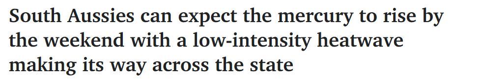 低强度热浪将席卷南澳,为南澳人带来炎热的一周。 周四至周日,阿德莱德的气温将达到35℃左右,下周初将逐渐下降到25℃。 "这种情况会持续较短时间,周末会有降雨带横穿整个州,下周初气温会迅速下降。" ...