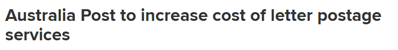据悉,澳大利亚邮政已提议从明年年中起将信件邮递费提高至每次50澳分。 ACCC专员Catriona Lowe表示,目前该机构正在就拟议的涨价征求消费者、企业和其他利益相关者的反馈意见。 Lowe说:"然后,我们将根据法 ...