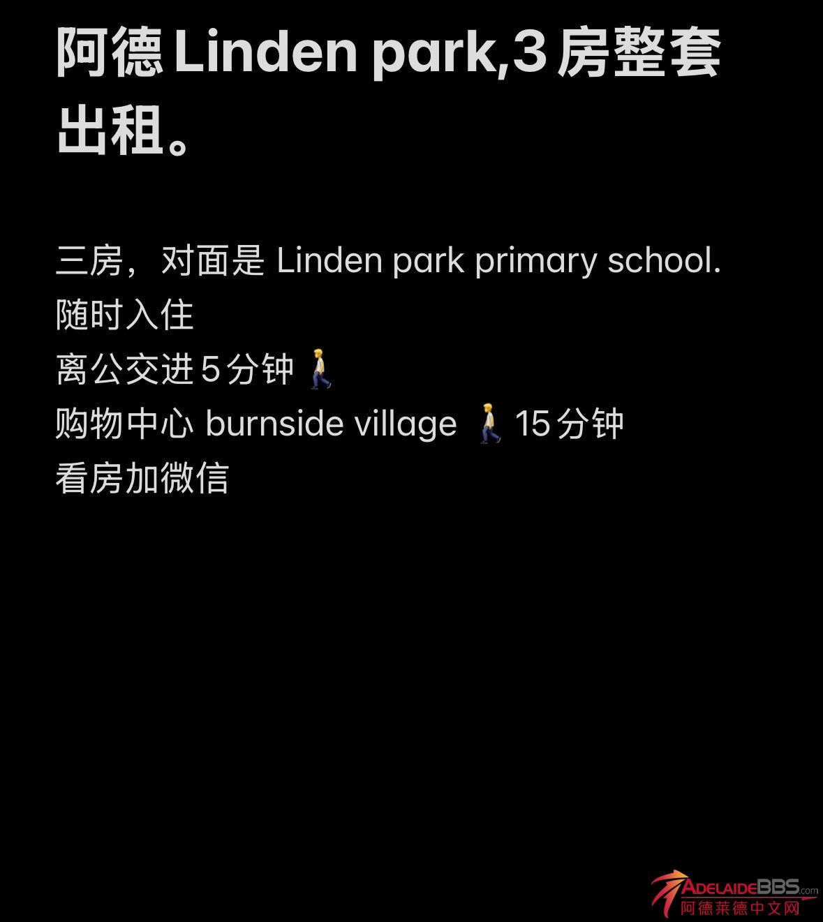 Linden park 学区 3房整租。 联系方式 0411 626 004 或者扫码微信。
