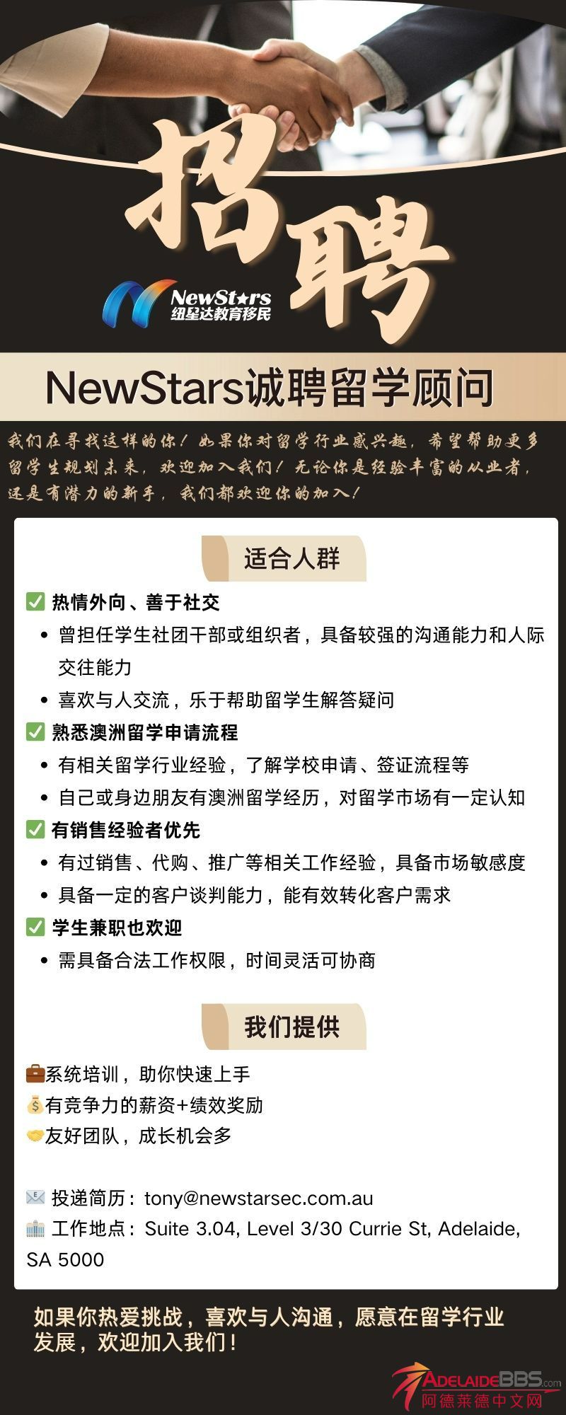 NewStars作为澳洲领先的留学移民服务机构,我们始终致力于为留学生和移民客户提供专业、贴心的服务。现在,我们阿德莱德团队正在寻找志同道合的伙伴加入我们!无论你是对留学行业充满热情,还是希望在移民领域深耕发 ...