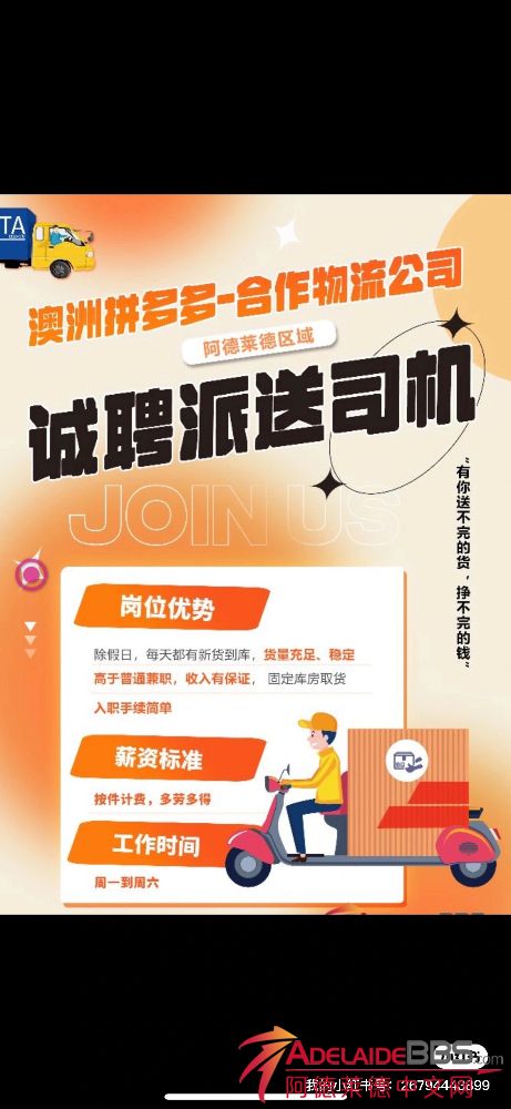 阿德莱德 物流公司招聘,急需包裹配送员! 【无经验要求】 待遇优厚!按件计酬,上不封顶! 要求:拥有车辆和驾照,能熟练使用智能手机! 新开仓库主要配送电商小包裹,目前有许多线路仍未有固定司机,采用先 ...