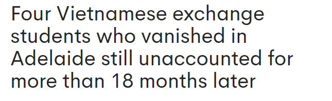 据《7 News》报道,四名越南交换生在阿德寄宿家庭居住期间突然失踪,至今已超过18个月,仍未被找到。 2024年1月8日,当时17岁的Sunnie Nguyen在与寄宿家庭在South Plympton的家中共进晚餐后,被发现从房间失踪。 ...