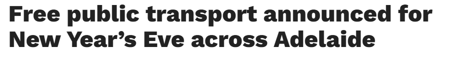 据报道,为帮助南澳居民安全庆祝新年,阿德全市及郊区将提供免费公共交通并增开班次。 从新年前夜下午5点至2026年1月1日清晨6点,整个都市交通网络的所有巴士、火车和有轨电车服务均免费开放,让您轻松参与庆祝活动 ...