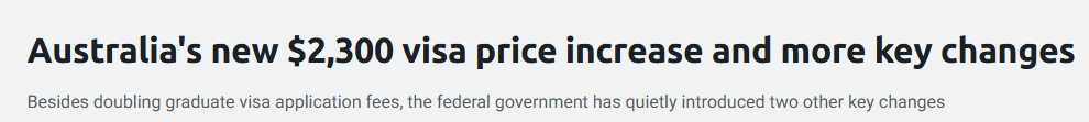 据《sbs》报道,澳政府已将部分毕业后工作签证的申请费提高了一倍。 澳大利亚国际教育协会首席执行官Phil Honeywood表示,该行业对这一仓促决定感到"非常不满"。Honeywood说:"很明显,联邦政府正将国 ...