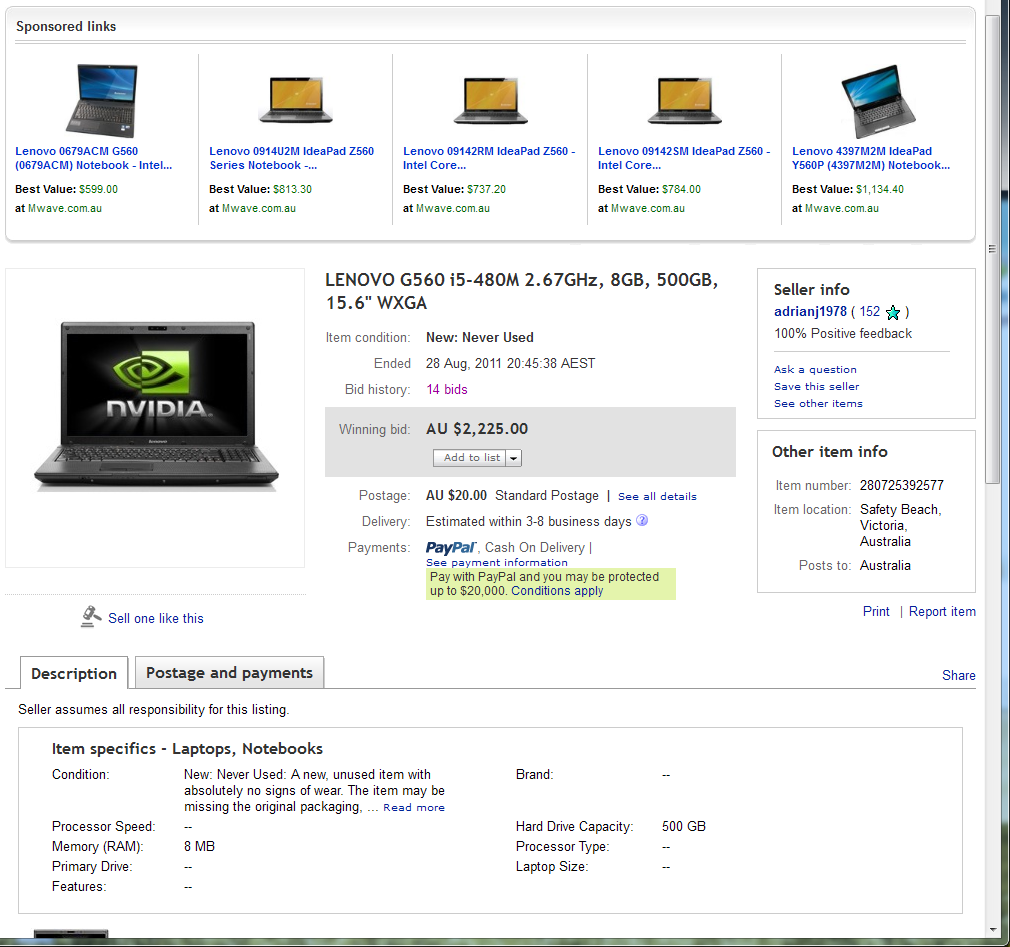 本帖最后由 09141111 于 2011-8-28 21:31 编辑 今晚刚结束的一个ebay上的Lenovo G560笔记本电脑拍卖。真不知道买家怎么想的,配置一般,居然可以拍到这个价钱,疯了。。。。。。 难道是恶作剧?