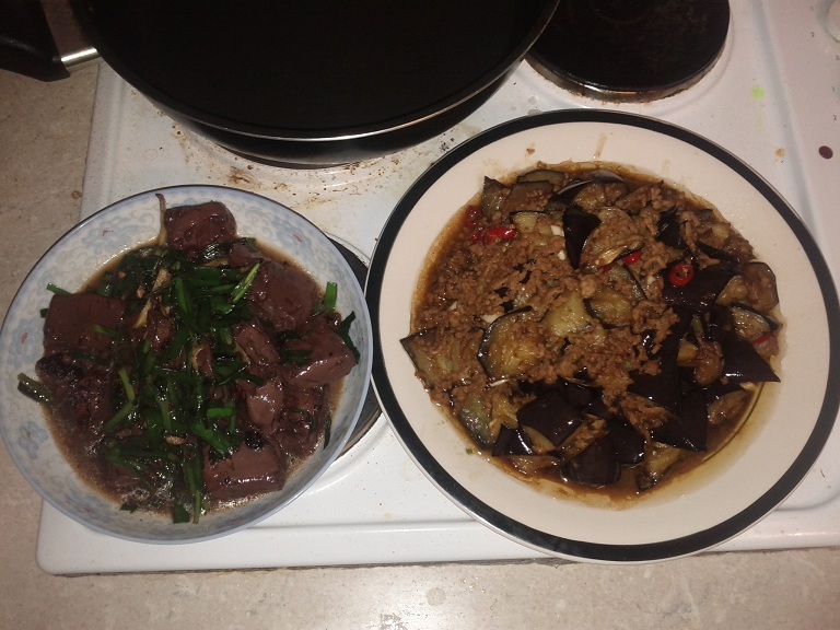 左边:韭菜炒猪红 右边:肉末烧茄子