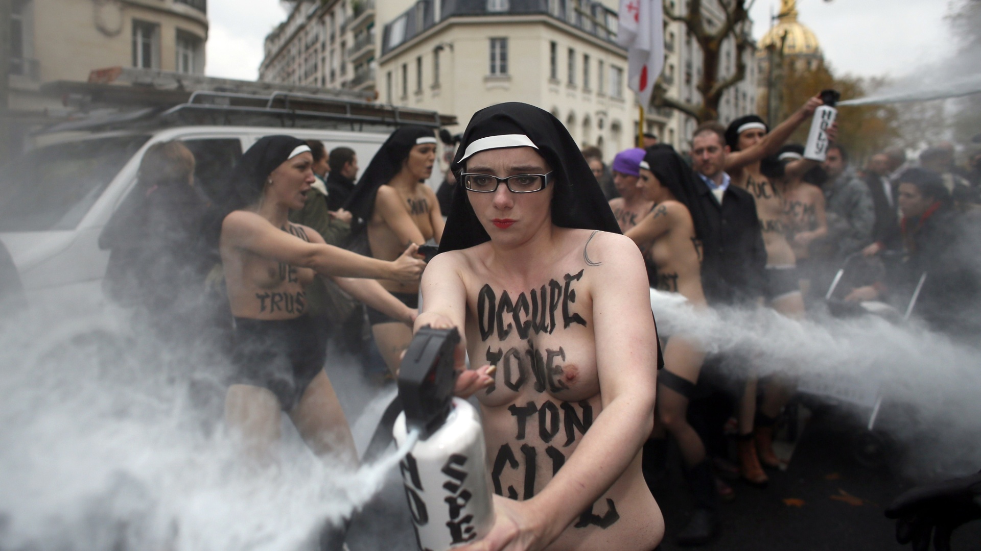 当地时间2012年11月18日,女权团体Femen的成员在法国巴黎举行半裸示威,抗议法国保守人士反对同性婚姻合法化,争取女性权力。她们在示威中高举革命标语、高呼革命口号,同法帝国主义反动 ...