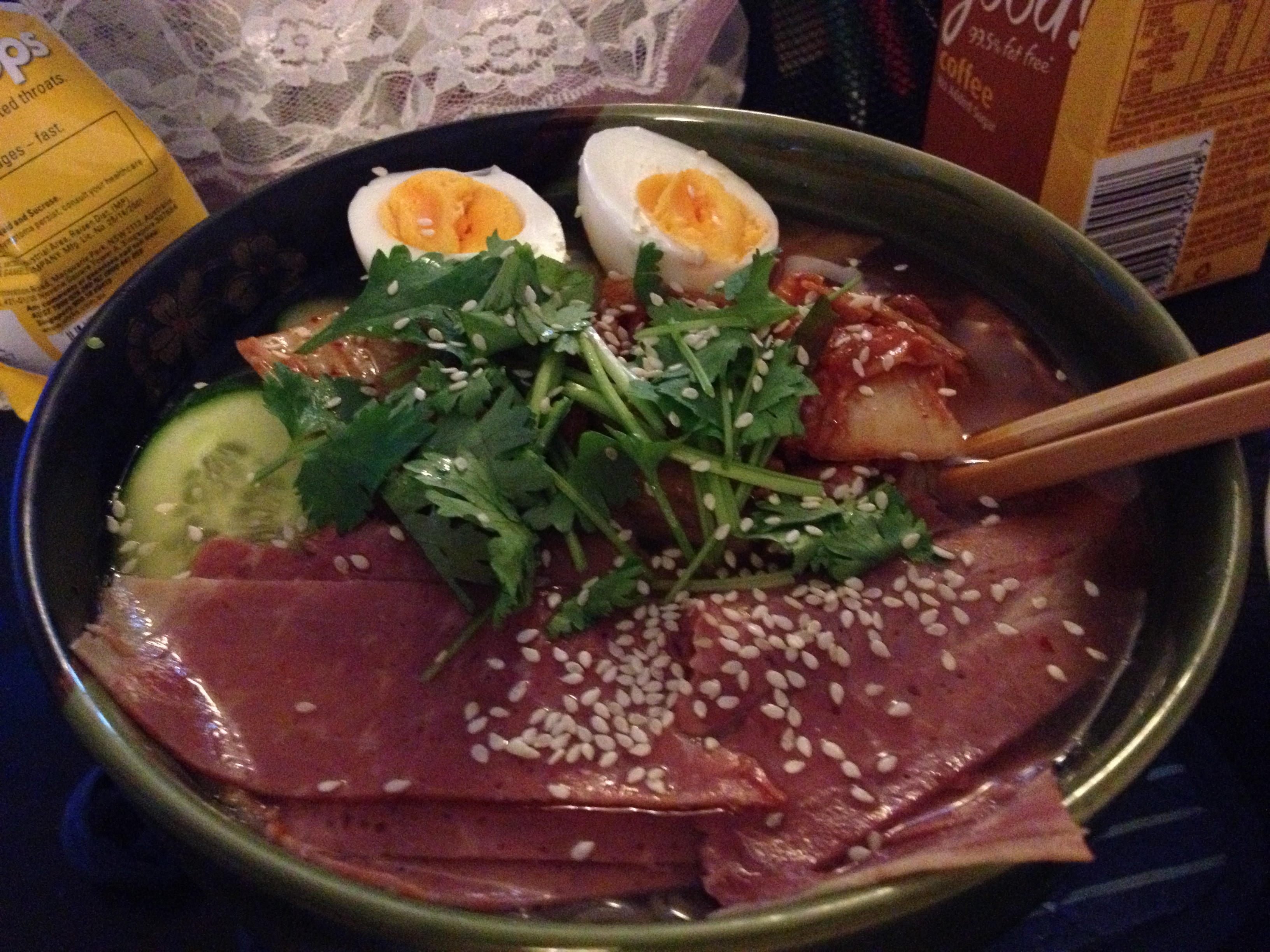 今天有点热,突然想吃冷面,就试着做了一次,味道还不错,牛肉就是local店买的那种silverside,辣白菜是之前自己腌制的,,老公说还挺像回事,(*^__^*) 嘻嘻……,下次要自己做牛肉才更好···