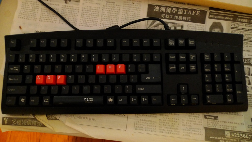 本帖最后由 ktd 于 2013-3-12 21:43 编辑 Cherry黑轴,PLU ML-G2000,SDFIOP六键为红色键帽,成色稍旧但使用完全无问题,几个特殊功能键有呼吸灯,打星际2,CS之类游戏都蛮趁手,因要入手另一把键盘而低价40刀出 ...