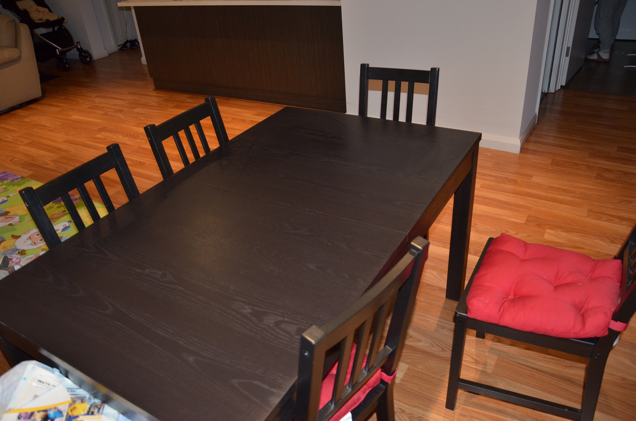 木质餐桌加六把椅子。餐桌可伸长,可容纳10人坐。4个月前 ikea $580购入,现因搬家仅售 $300。 先到先得。 联系电话:0430816200 qq: 64066817