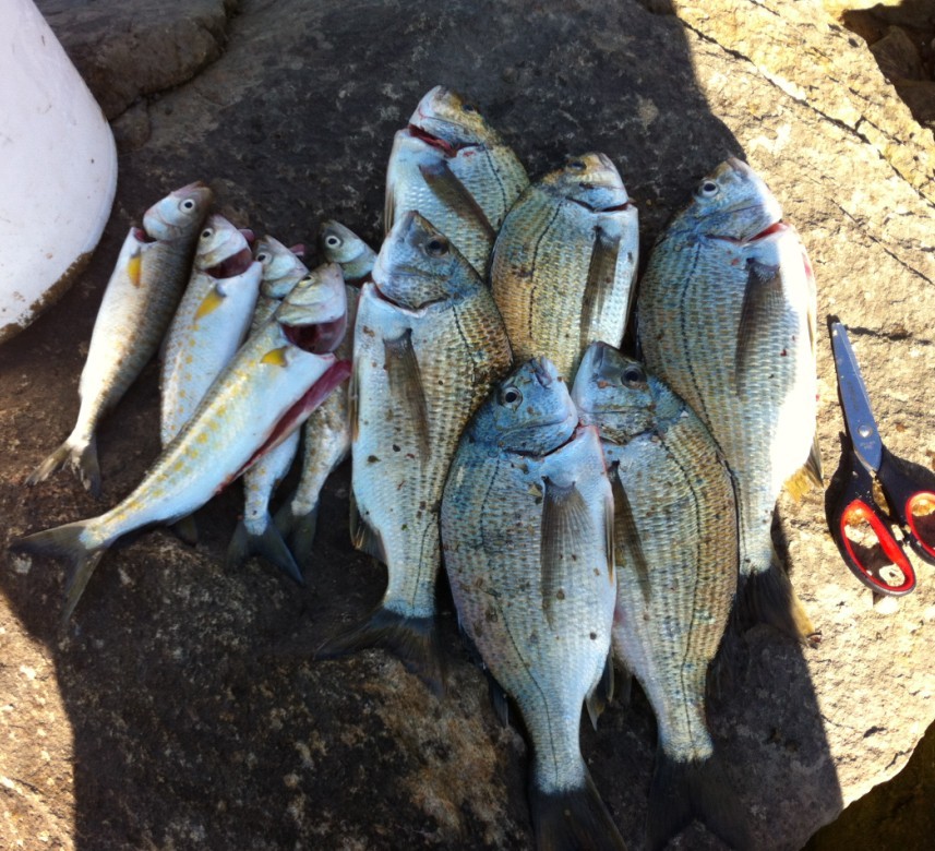 一上午两个人的渔获,上岸后跑了一条大的(那条鱼估计能长寿),扔了若干不太够SIZE的,唉。。。钓点鱼不容易,想喝点鱼汤,难啊。。。
