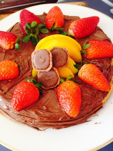我家没有烤箱,经常用电饭煲做蛋糕培直接吃,今天突然想做成真正的蛋糕,所以涂了一层巧克力酱,超市的费列罗的味道最好,因为没有工具用叉子涂的所以乱七八糟,还摆了草莓新鲜的,黄桃罐头的,巧克力块直接买的,大 ...