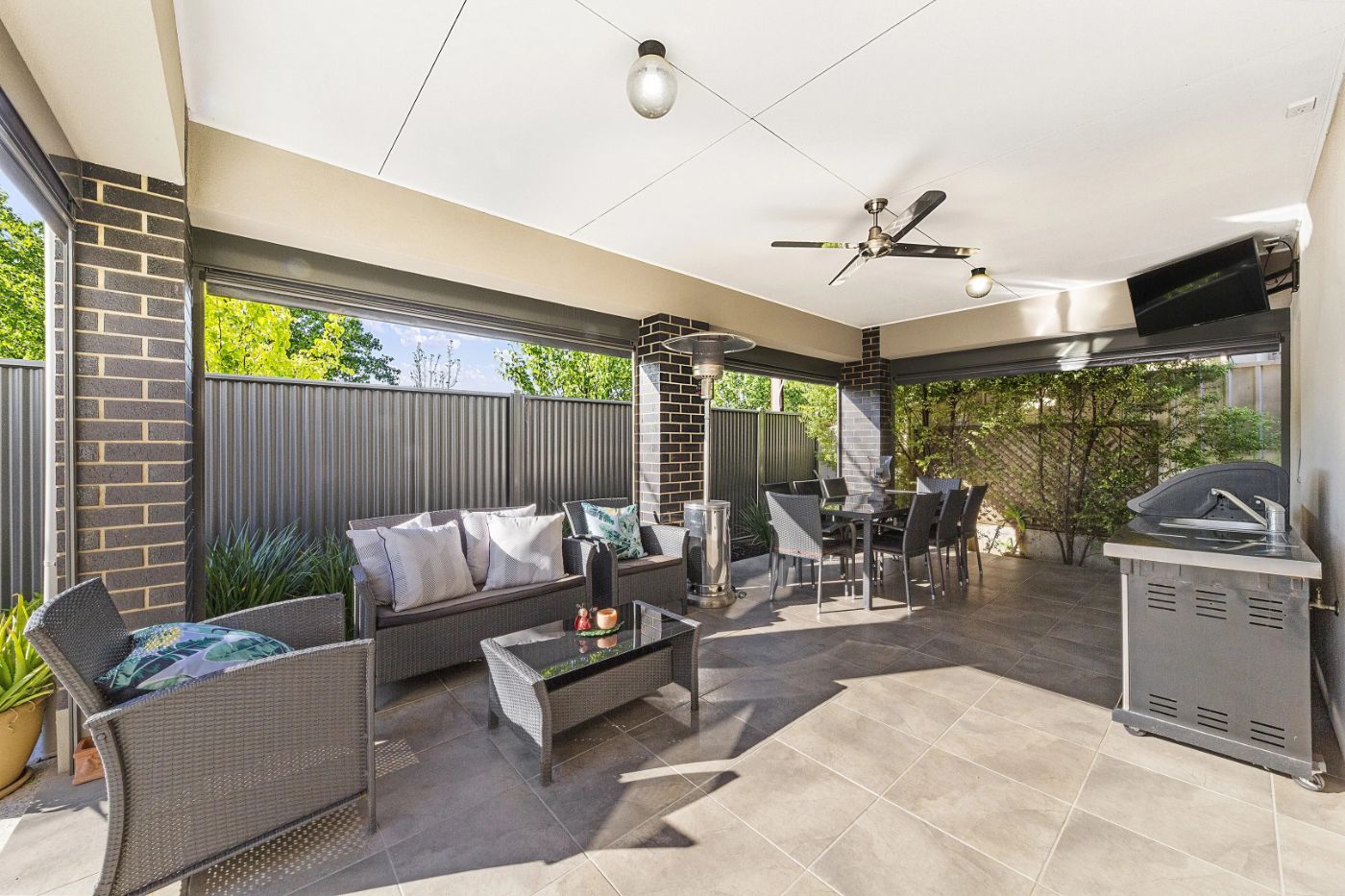 带顶棚的户外娱乐区(Alfresco),配有 PVC 卷帘,可全年使用