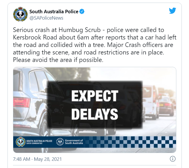 据澳媒报道,今天早上Adelaide Hills 的Humbug Scrub发生严重车祸,一汽车撞树后车内驾驶位的男子当场死亡。