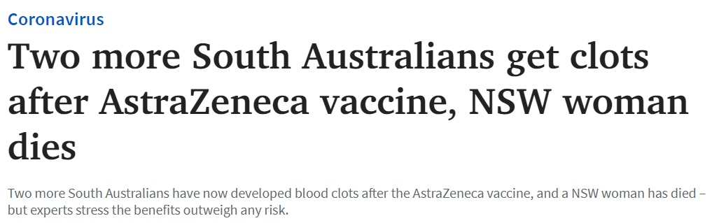 标题: 突发!南澳两人在注射阿斯利康后患上血栓!新南一妇女因血栓死亡!