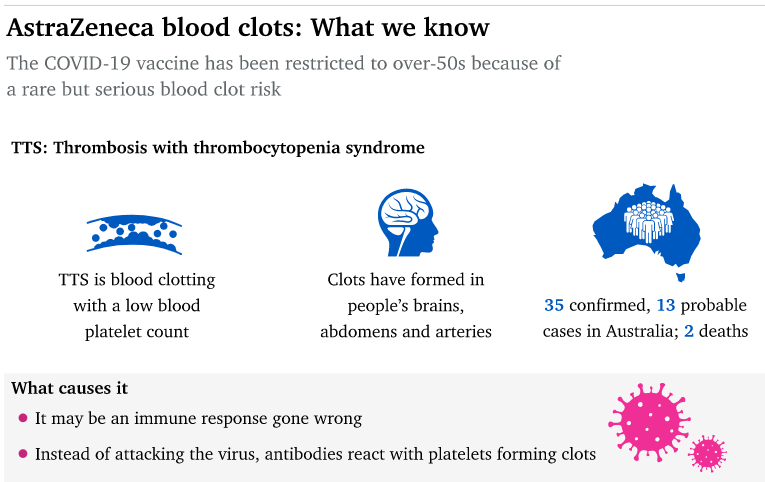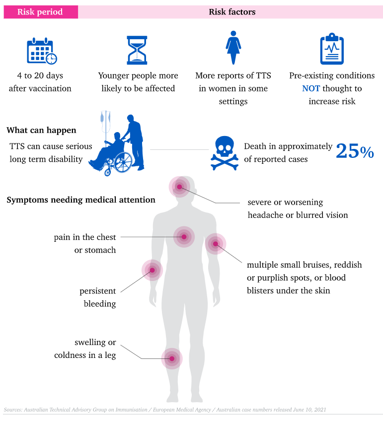 TGA强调,血栓极为罕见,疫苗对Covid-19的好处超过了风险,但也可能有轻微的不良反应。