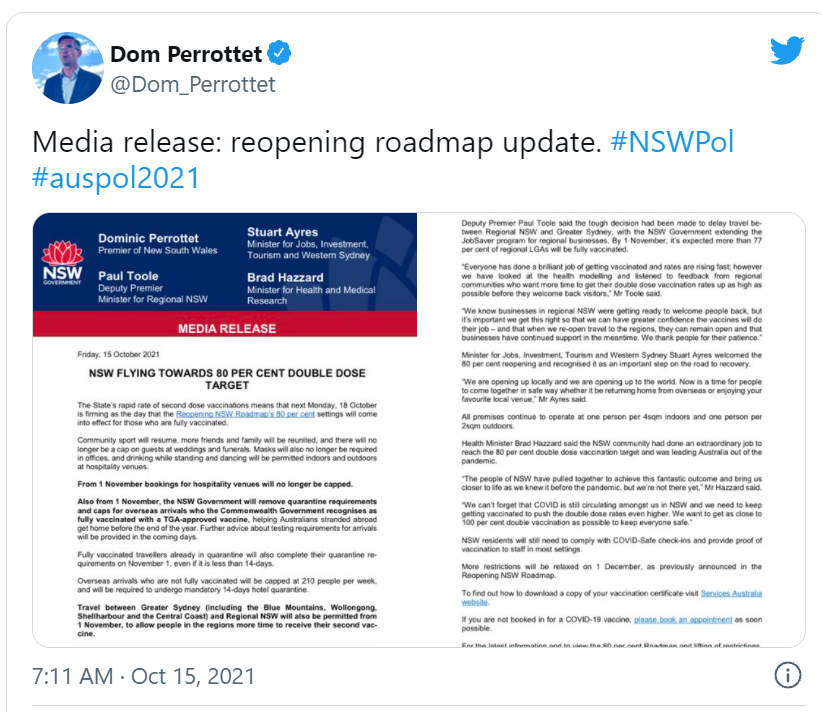 新南威尔士州州长Dominic Perrottet周五宣布了这一消息,宣布悉尼和新南威尔士州将重新向世界开放。