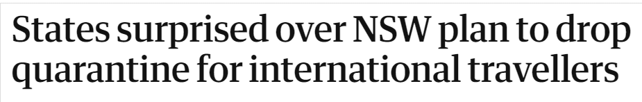 新南威尔士州政府计划从下个月起取消对完全接种疫苗的国际旅行者的隔离要求,这让澳大利亚其他各州大吃一惊,并引发了对国内边境管制的重新思考。