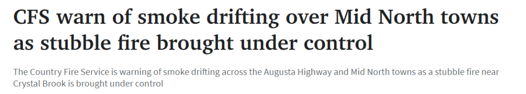 标题: CFS警告:南澳Crystal Brook附近的茬火得到控制后,烟雾将在中北部城镇上空飘散!