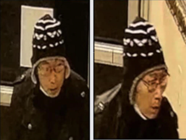 图片显然来自监控摄像头,显示一名戴着帽子和眼镜的亚洲男子。