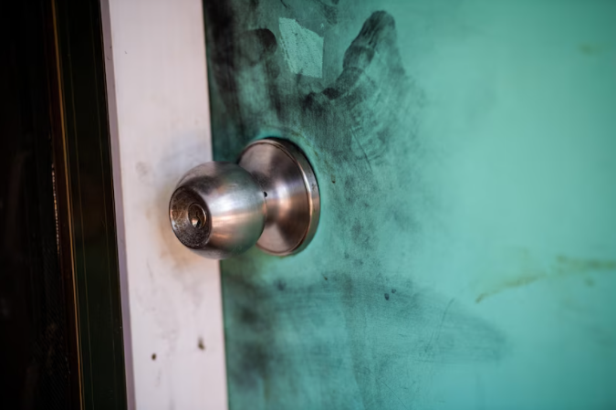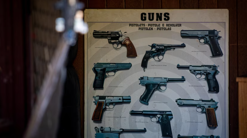 在该房屋的门后,有一张以不同类型的手枪为主题的海报。
