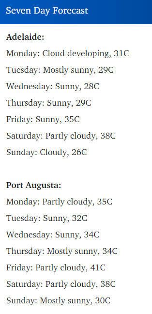 各地区也会有类似的情况,预计Port Augusta的温度为35℃,Renmark的温度为33℃。
