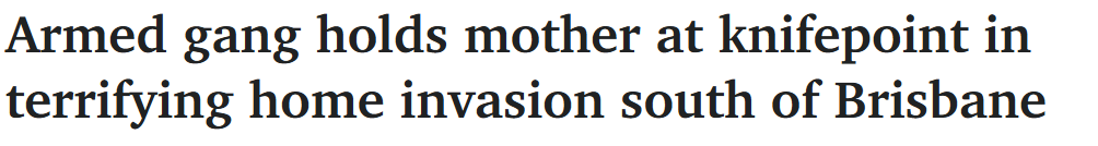 据《couriermail》12月9日报道,布里斯班南部发生恐怖入室抢劫案,一名母亲躲在浴室报警之际,持械青少年以刀枪相威胁。