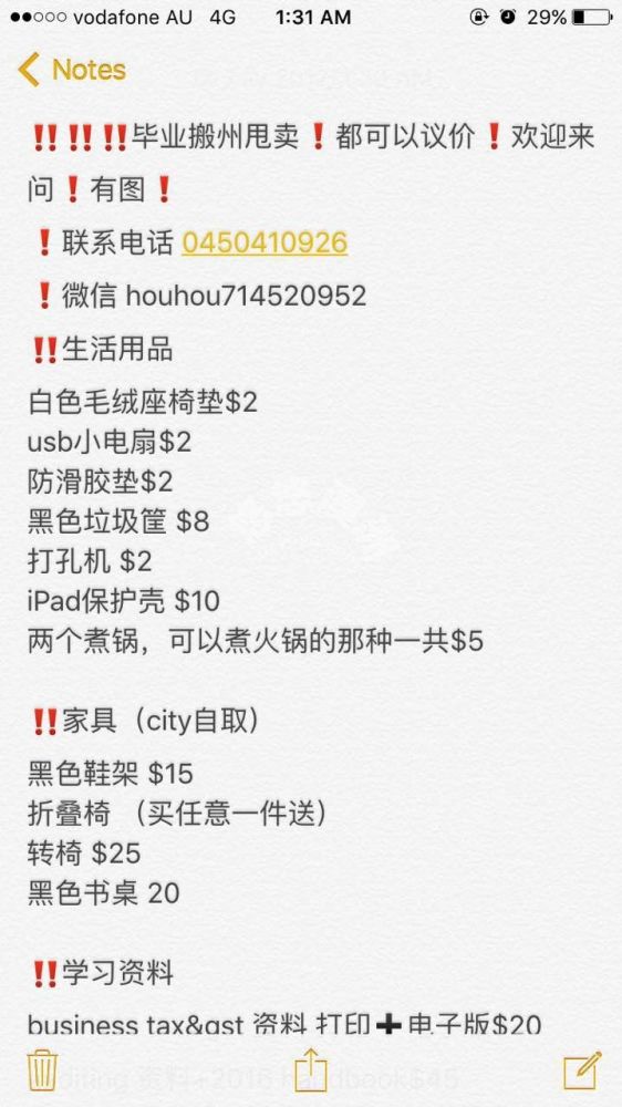 ‼️‼️毕业搬州甩卖!都可以议价!欢迎来问!有图! 联系电话 0450410926 微信 houhou714520952 ‼️生活用品 白色毛绒座椅垫$2 usb小电扇$2 防滑胶垫$2 黑色垃圾筐 $8 ...