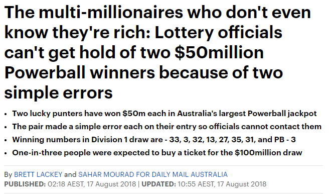昨晚(8月16日), 澳洲史上最大的强力球(Powerball)大奖开出, 两位幸运儿“瓜分”1亿澳元巨奖! 但让人没想到的是,到现在都没办法联系上他/她们...... 据统计,每三个澳人中就有一 ...