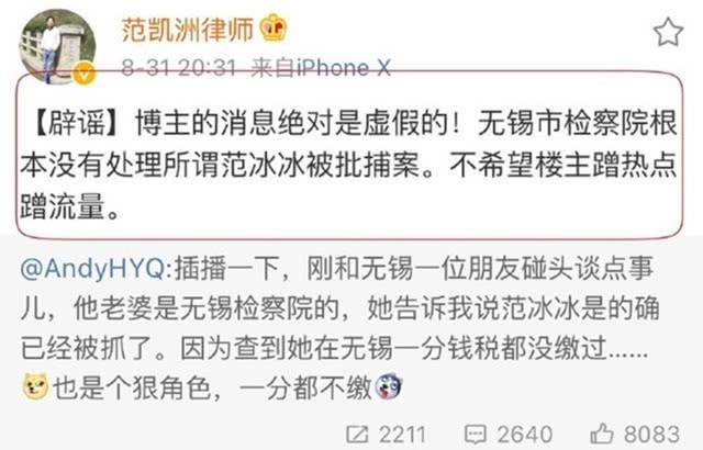 辽东春秋 近日关于范冰冰的传闻特别多,先是有人爆料她和李晨分手,当时李晨工作室直接否认两人还是情侣关系。黄毅清在微博爆料范冰冰没有在无锡纳税,所以被捕了。但很快无锡权威律师范凯洲为范 ...