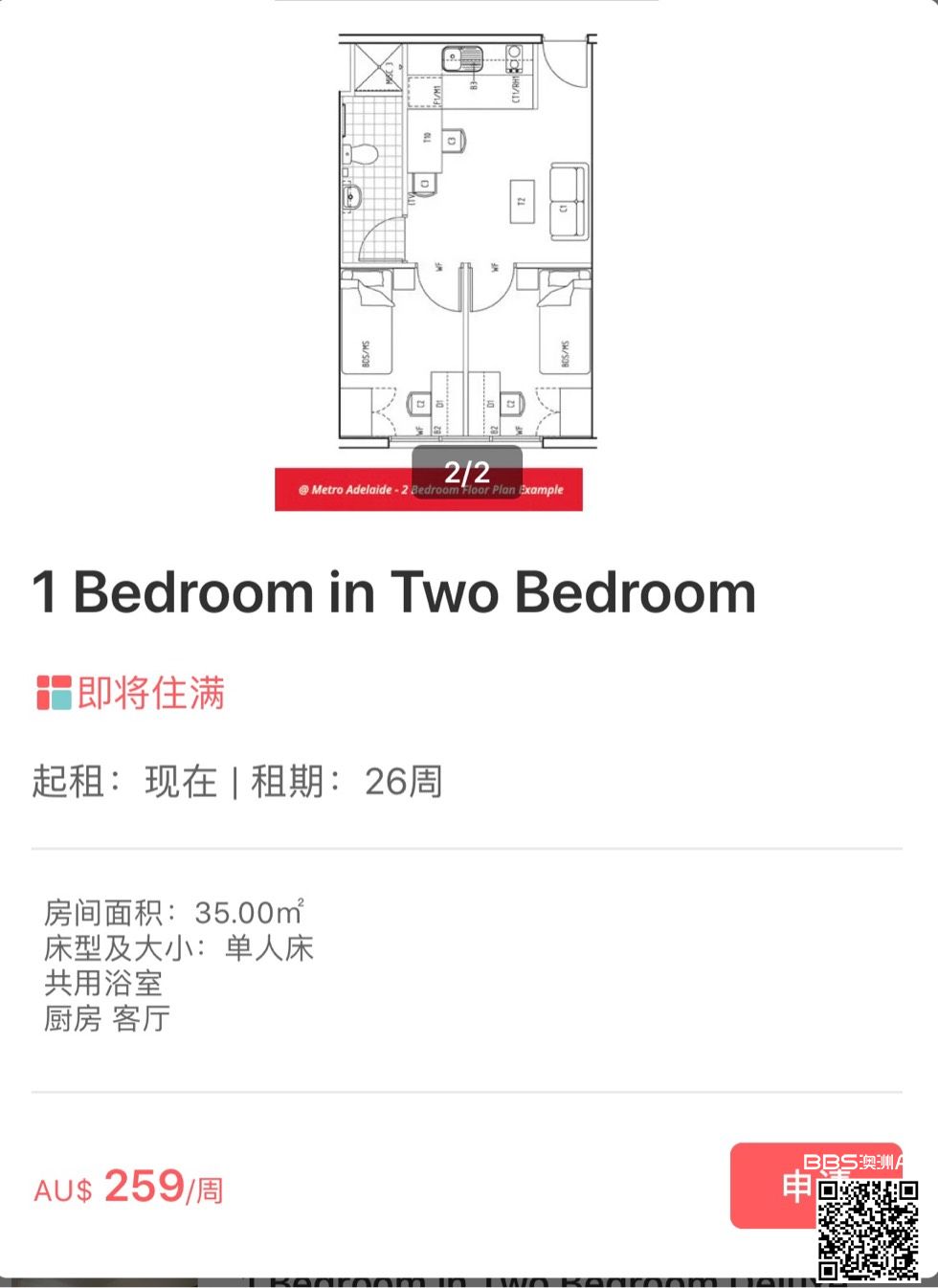 本人学生一枚,来阿德莱德读预科,十一月结束,公寓合同到19年2月份,期间希望找一个接租的小伙伴。公寓位于市中心rundle mall生活非常方便,附近有超市和KFC和麦当劳。tram和 公交车站仅两分钟路程。离阿大和南澳大 ...