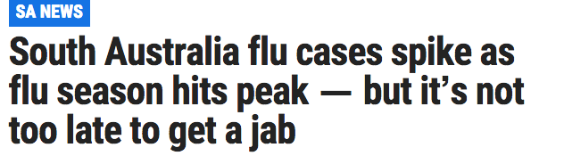 过去一周,南澳流感病例激增,南澳流感季也随之进入高峰期,不过,现在接种流感疫苗也为时不晚! 医生还提醒,如若身体不适,则不宜上学、从事儿童保育或上班等,直到退烧后24小时,以免流感传播扩散。