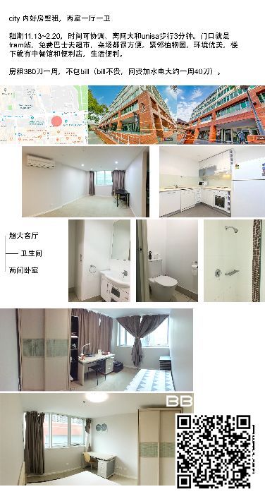 city内 好房出租 两室一厅 380+bills per week 3mins到阿大南澳 11.13~3.20 欢迎看房~