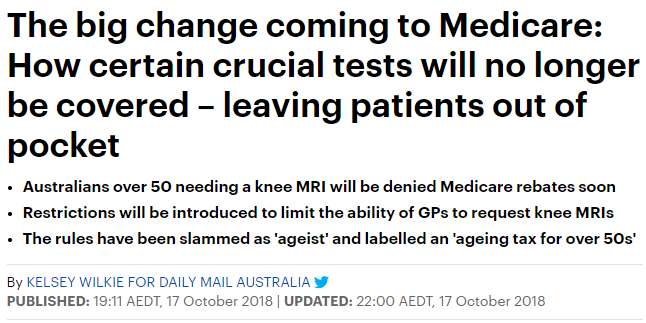 最近,一项政府调查发现,澳洲纳税人为那些持医保卡可报销做膝关节核磁共振的人共掏了3800万澳元的昂贵费用! 5年前这一费用还只有1600万澳元。 短短五年时间,翻了一倍还多! 所以政府决定,从下个月起,医保将 ...