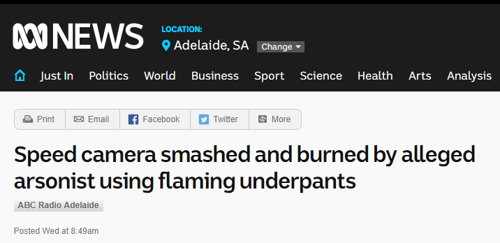 昨天凌晨12点20分左右, Anzac Highway 和 Greenhill Road交叉口的测速摄像头被人砸了, 砸完之后,还放火烧...... 急救部门也被叫到了案发现场,警方随后在现场抓获了一名嫌犯。 警 ...