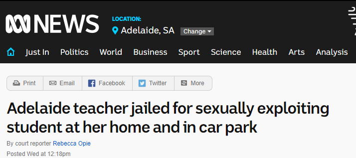 前段时间, 43岁阿德莱德教师Sonia承认对一名17岁男学生持续性剥削, 现在终于被判了! 在向法庭宣读的一份声明中, 受害人表示,他对发生的事情感到羞愧和尴尬,感觉他仿佛失去了两年的生命, “我的梦想 ...