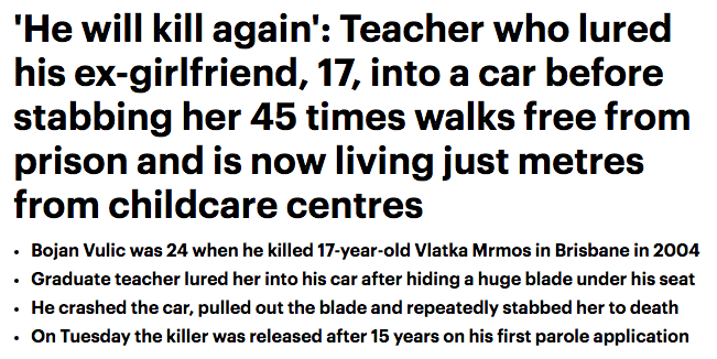 地狱空荡荡,魔鬼在人间! 据报道,一名教师用一把美国军刀连捅了他未成年的前女友45刀!仅仅在监禁服刑了15年后出狱了!更令人难以置信的是,他竟然住在了离公园及儿童看护中心只有几米远的地方! 据悉, ...