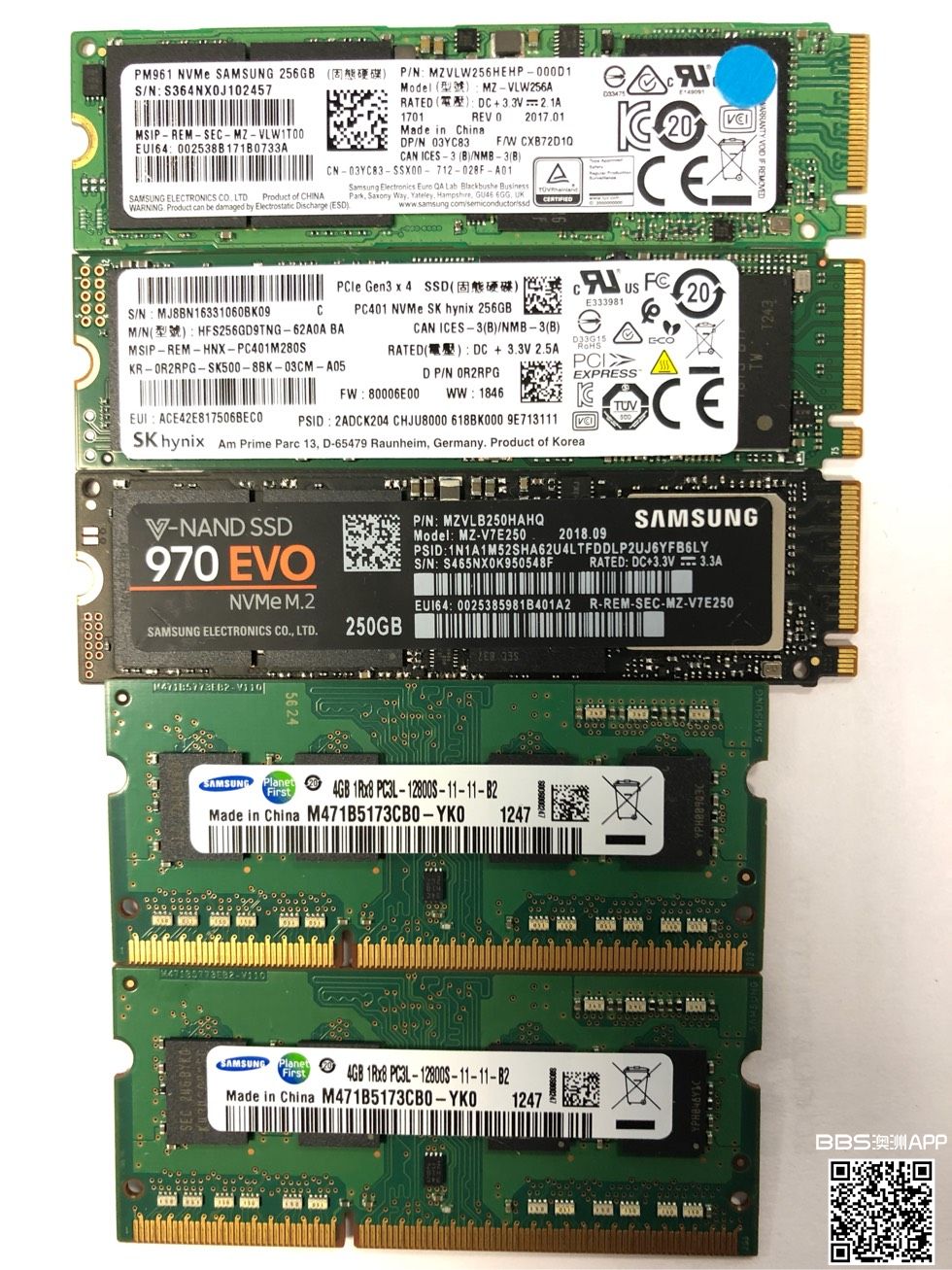 三星 PM961 256g $50 SKhynix 256g $40 三星 970evo 250g $80 三星笔记本内存 ddr3 4g $30 微信 xizhang0222