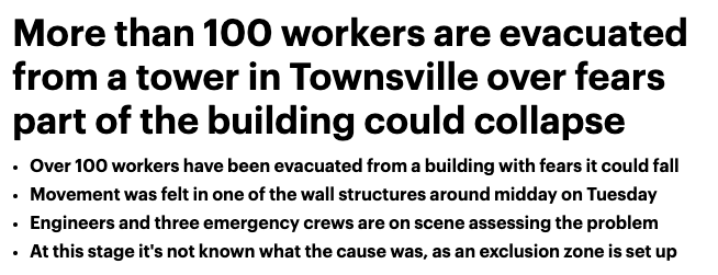 周二中午,昆州Townsvill的Suncorp商业大厦发生了惊魂一幕! 大楼的一面墙体发生了位移。 Suncorp Bank表示,正在与紧急服务部门和物业合作。 “我们的首要任务是确保工作人员和区域的安全。” “Suncor ...