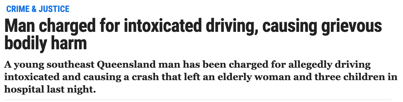 昨晚,昆士兰一名年轻男子因涉嫌醉驾,导致车祸多人受伤! 据报道,警方将指控一名23岁的男子在夜晚逆行, 在Crestmead的Fifth Ave与另一辆车相撞, 相撞车辆的司机是一名70岁老人,受伤情况严重, 车 ...