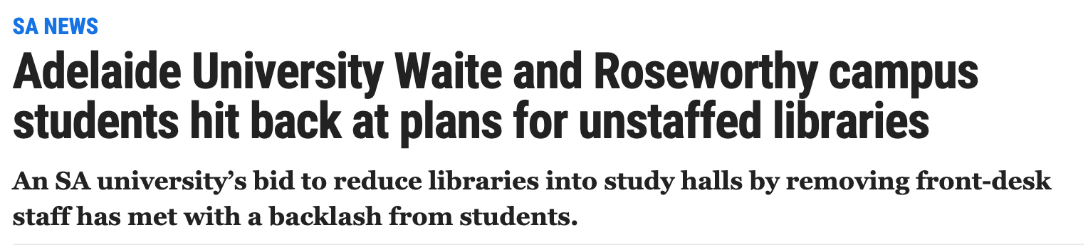 下周起,阿德莱德大学的这两个校区的图书馆将无工作人员,或仅有一人, 此举引发学生不满! 学生代表委员会的一项调查发现,68%的Roseworthy校区学生认为这一变化会对他们的学习产生负面影响。 “我们不需 ...